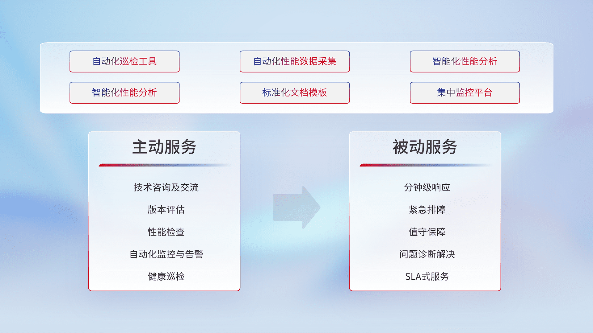 智能化工具和标准化文档,,,保障服务质量,,,提供主动服务(包含技术咨询、、版本评估、、、性能检查、、、自动化监控与告警、、健康巡检)和被动服务包含(分钟级响应、、、紧急排障、、、值守保障、、、、问题诊断解决、、、SLA服务)。。