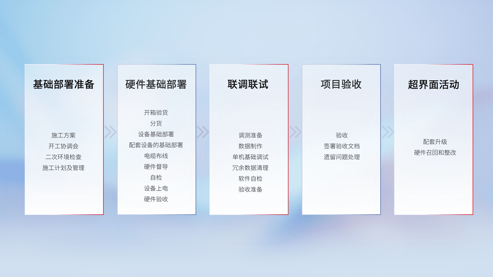 从基础部署准备、、、硬件基础部署、、联调联试、、项目验收、、、越界面活动的全过程可追溯,,,保证施工质量和进度。。